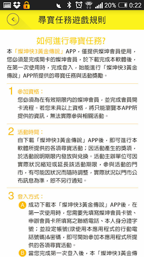 *於IOS及Google Play進行下載 → 安裝燦坤黃金傳說APP → 登入燦坤實體會員卡號 → 前往燦坤指定門市 → 啟動《燦坤快3黃金傳說》→ 燦坤會員還元金查詢、免費咖啡膠囊兌換、還元金免費輕鬆獲得!!