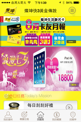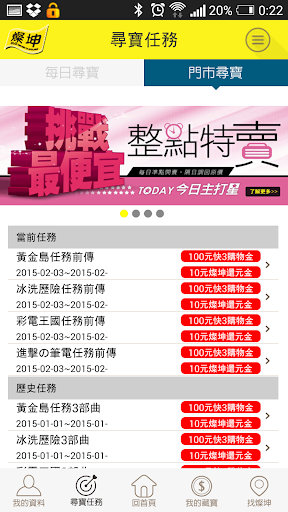 2.今日任務牆,找尋屬於自己專屬的黃金傳說,破解任務獲得免費點數(燦坤還元金、快3購物金)。
