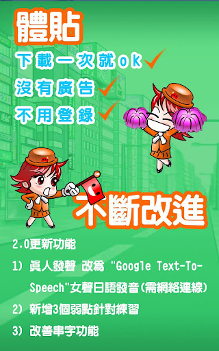 2.0新增功能 1) "Google TTS"女聲日語發音 2) 弱點針對練習 3) 改善串字功能