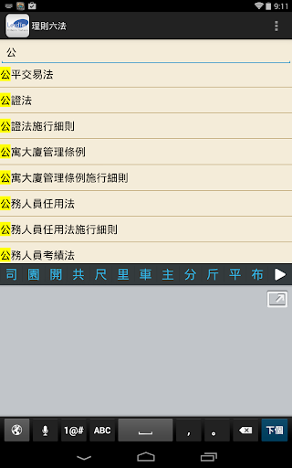 涵蓋市面上六法全書大部分法規,目前收錄四百餘部常用法規: