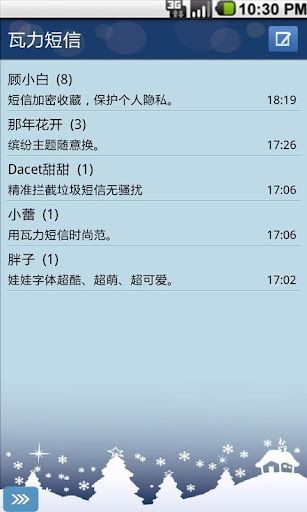 应用主题:下载并安装完“冬雪飘零 ”后,进入瓦力短信—菜单—换肤—选择已安装的“冬雪飘零 ”,点击应用。