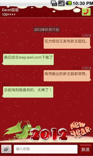 应用主题:下载并安装完“Happy2012 ”后,进入瓦力短信—菜单—换肤—选择已安装的“Happy2012 ”,点击应用。