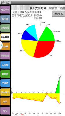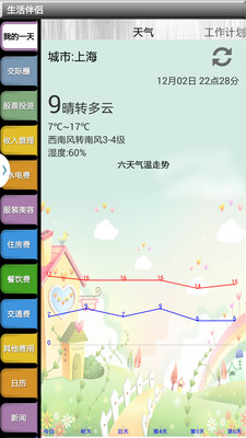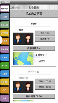 本应用是一款生活管理类应用,可以帮助年轻人以及普通家庭合理管理自己的收入开支,管理一些琐事避等。主要包含以下几方面功能:1 天气预报;2 工作日程管理;3 约会管理; 4 按月收支曲线(用于观察月输入走势);5 支出饼状图(帮助人们清晰了解支出的比例) 6 净收入趋势图(所有收入扣除开支的趋势);7 收入及支出流水功能;8 启动第三方社交及日历等应用