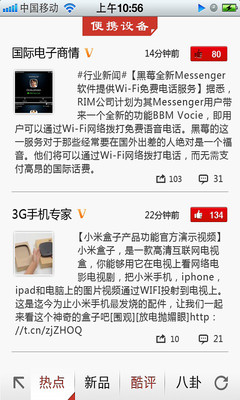 微博电子圈除了与众不同的产品定义和服务以外,还在用户体验和功能上做出了许多创新。用户不仅可以仅选择自己所关注的内容频道查看,还可以方便地与相关微博的编辑、作者和相关厂商进行互动。为了弥补微博内容字数的限制缺陷,我们还提供了长链接内容自动读取的功能,更将相关网页内容经过压缩和重新编排以适应便携产品小屏幕的排版,让用户不仅大大节约了流量、提升了下载速度和阅读体验,还可以方便地收藏、分享或者放在“稍后阅读”栏目待有时间时进行深度阅读。