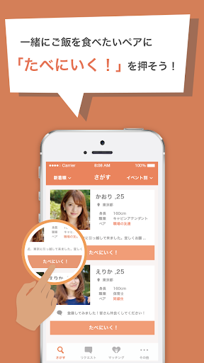 気になるペアに「たべにいく!」を送ってみよう。相手ペアが承認すれば食事会が成立です。