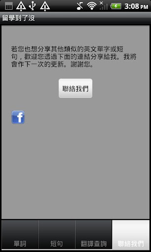 "留學到了沒"是一個收集留學生和一般到國外的人會用到的英文的小軟體。希望藉此讓大家到國外能很快地適應,也希望能提供你一些在英文教科書上學不到的字彙。