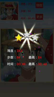 游戏还可以为玩家的成绩评星级,共分为三个星级,玩家拼图成功即可得一星,拼图过程中移动的步数与游戏时间分别占一星,玩家成绩越好,得到的星数越高。
