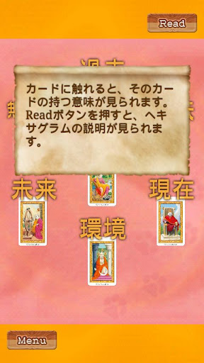 ★「初心者でも安心」…カードの並び方の意味やカード自身の意味など、解説をその場で見ることができます。