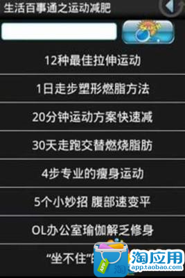 一、生活百事通之运动减肥收藏了大量运动减肥的知识。带有查询功能方便你随时查看! 二、秘籍搜索:点击进入此功能界面后,输入你想查询对象的部分文字,即可按搜索按钮进行搜索,点击搜索列表项就 可查看对应内容,为防止手机内存不够,查询只显示前20个结果。 三、阅读秘籍:点击进入后可以查看全部百科信息