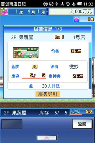 开发了暖暖温泉乡,游戏发展国,足球物语的开罗公司(Kairosoft)出品,一款经营百货商店题材的模拟经营游戏,完全中文版.楼梯,电梯,停机坪等,甚至每家店铺都可以自由配置.人气超过一定数量之后,还会设置狂热客人的系统.投资活动可开拓周边地区,将它打造成为在回头客中人气第一的百货商店吧.你能建造一座超一流的购物中心吗?盖一座直破云霄的神奇百货大楼吧! 2012-07-12Ver3.4.6更新说明: *增加部分店内设施