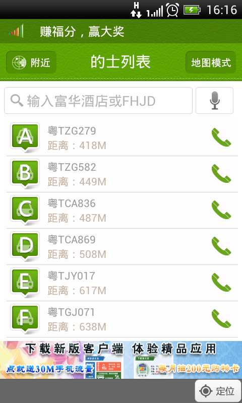 提供中山市用户通过安卓智能手机客户端进行中山的士信息的查询;包括客户端地图模式的查询和列表模式的查询功能;并提供当前位置定位,自动搜索当前位置周围六辆的士车进行展示;提供地图、列表的士车的车牌、司机电话;提供直接拨打司机电话进行电召功能;提供附近功能模块,查阅附近POI信息;提供移动广告推广及微博分享等功能;
