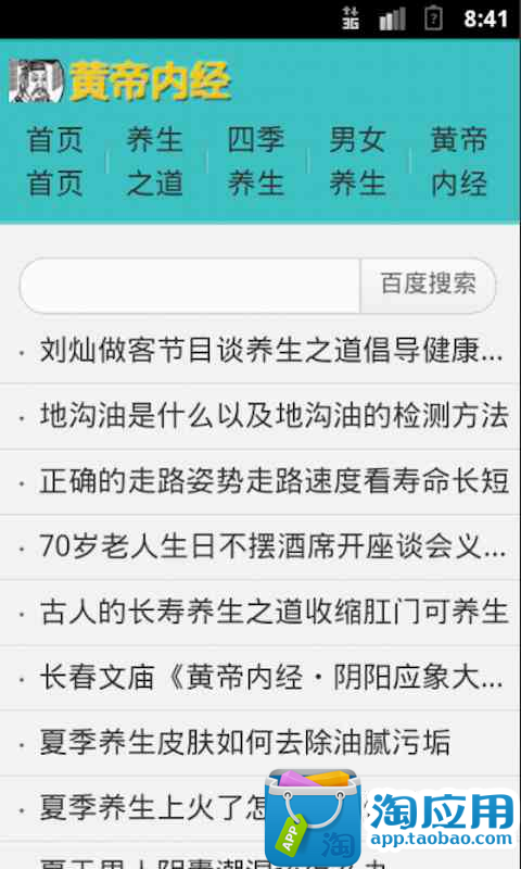 本应用具体为人们提供了各种养生方法,从古代医学的神秘境界、阴阳五行、顺应四时、十二时辰、经络养生、脏腑养生、自然养生、情志养生、饮食养生、运动养生、环境养生等方面的具体养生要诀