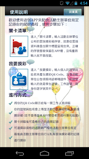 現在,國立中興大學管理學院前瞻無所不在商務實驗室的研發團隊設計出「私有雲端摸彩箱APP」來解決這個問題,要參與闖關活動的民眾可以用這個APP來產生代表自己的條碼,然後在過關時讓關主用他的手機掃瞄你的條碼,完成這關的記錄就會上傳至活動主辦單位的私有雲端摸彩箱 。「私有雲端摸彩箱APP」有分為關主版及闖關版,請造訪開發人員的網站詳閱「闖關集點方式」及「關主功能使用說明」。