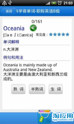 本软件涵盖 职称英语B级必备高频词汇973个。方便,高效,做到一个应用在手,背单词随时随地的背单词。