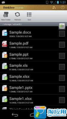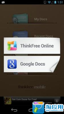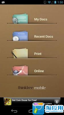 由于硬件制造商正迅速采用谷歌的Android开源移动平台,移动办公室ThinkFree Office Mobile也终于移植到Android操作系统了,这款办公软件在业界领先,提供了多种手持设备,自由选择其移动办公套件,需要android 2.0以上支持!主要特性:- 兼容Microsoft Word/Excel/Powerpoint- 浏览/创建/编辑文档- 浏览Adobe PDF文档- 发送/浏览电子邮件附件- 无缝集成到ThinkFree Online- 支持Google Docs