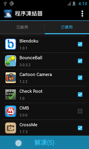 這個應用可以幫助你凍結你不想要的應用程序。應用程序被凍結後,不能啟動,也不會在後臺運行占用內存。如果你想再次使用該程序,可以解凍它。