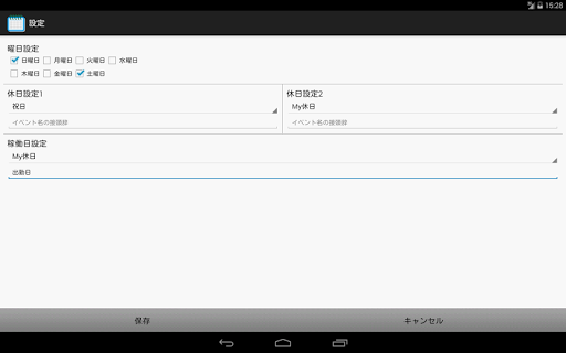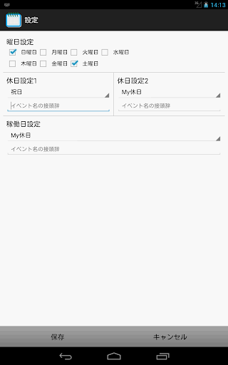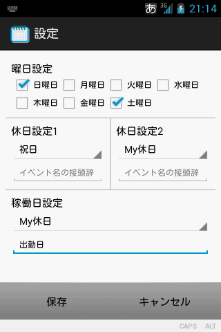 ・稼働日設定:曜日設定は休日設定にかかわらず稼働日として扱うイベントを指定します。自分の勤務先の出勤日を入力しておくとよいでしょう。