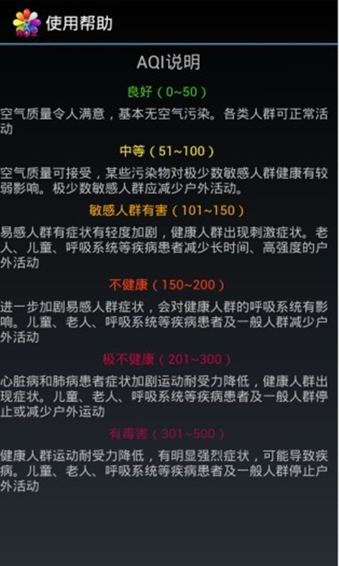 空气质量监测应用,提供全国77个的城市,497个监测点的空气质量的信息.详细表明了空气质量指数,空气质量等级,对健康的影响以及建议采取的措施.