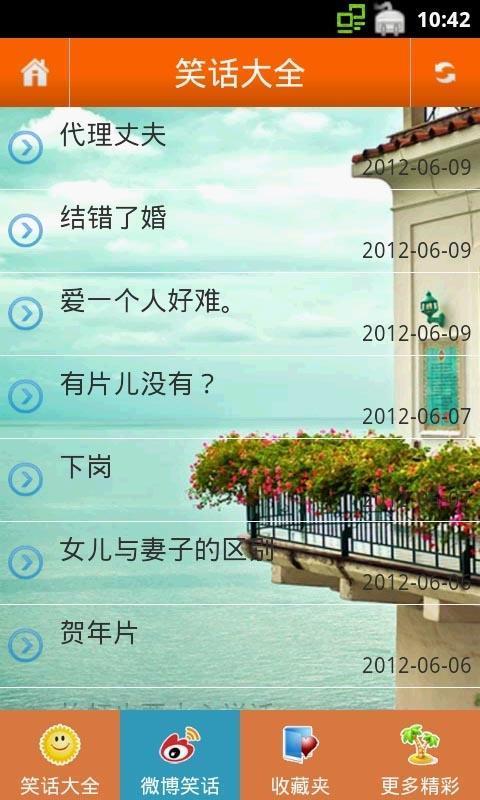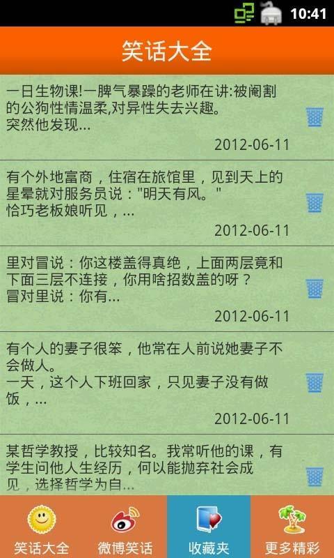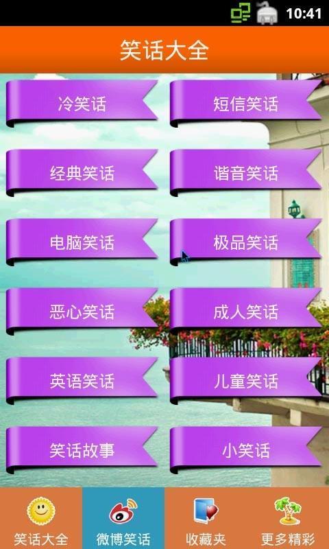 笑话大全是一款聚合大量笑话内容的Android应用,是目前市场上分类最多的笑话软件,笑话内容在线实时更新,后台专用接口,有效减少传输数据量,增加了本地离线收藏夹功能,只要添加到收藏夹,就可以离线浏览,还有复制转发功能。用心打造最大最全的网络笑料,希望笑话能给您带去轻松快乐的心情!