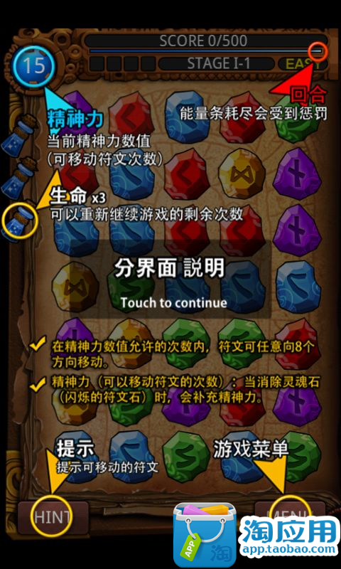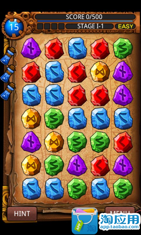 《符文大师 RuneMasterPuzzle》这并不是传统的逢三消除哦,在游戏中,不仅上下,左右相邻的符文,甚至斜45度角上的相邻符文都可以进行互换.而且和传统三消最不同的是,移动后并不急于消除,也就是说,和传统三消“移动后如无法消除”就不让移动的规则,在这里是不存在的.所以你可以通过多次移动,将同色符文预先移到一起,最后再加一个来进行消除.最狠的就是横竖都排上4,5个,中间空一个,然后从斜45度移动一个过来,就可以造成超帅的消除.每一关里你可以移动的步数是有限的!也就是所谓的能量,显示在左上角,比如第一关初始时只有15,你每移动一步都会减少,减到零就 Game Over 了.所以你需要关注符文中闪耀着“光芒”的那些,消除这些符文可以补充能量!非一般的消除游戏,会让你痴迷!