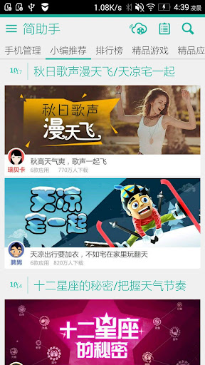 简应用助手精心为用户挑选最优质的Android应用与游戏,所有应用均经过人工严格筛选。应用内容囊括了聊天通信、上网购物、新闻资讯、生活工具、办公学习、影音娱乐、旅游出行、金融理财等热门类别。作为暴风影音旗下最新产品,运营编辑每周会从海量APP中帮助用户发现好玩应用,我们励志为每位安卓用户提供绿色、优质、安全、免费的APP服务,帮你逐渐变为安卓达人。应用本身操作简单、方便,完全满足android用户的操作习惯!不仅如此,简应用助手还提供多种媒体文件管理功能,让您可以轻松管理手机。