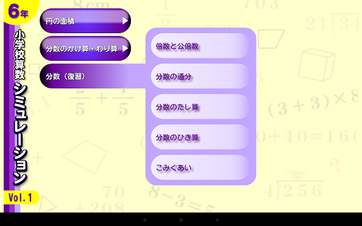 円の面積の求め方(3種)・分数×整数・分数÷整数・分数×分数・分数÷分数・分数の復習(5種) 全12プログラムを収録しています。