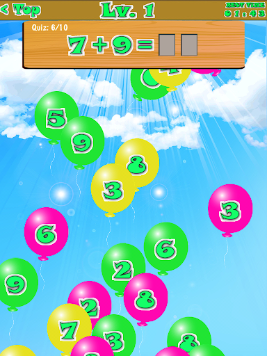 選擇模式後,計算問題會顯示在畫面上方,同時從畫面下方飄上來許多數字氣球。點破需要的數字氣球來回答計算問題。在限制時間內計算并找到需要的數字氣球并不是一件容易的事情哦!對自己的心算能力有信心的來挑戰一下吧!希望提高心算能力的也一定來嘗試一下哦!!