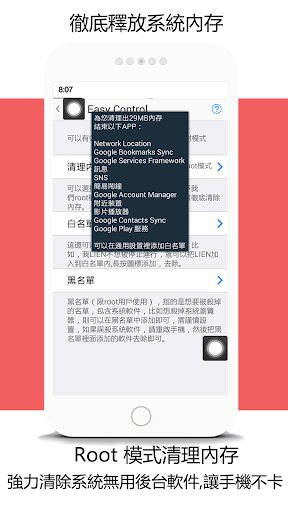 3、內存清理,任何時候都可以清理內存,root後黑名單想清理哪款軟件就加哪個。