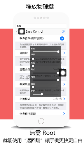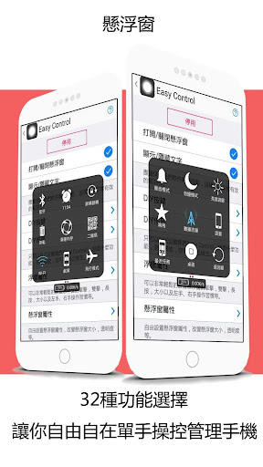 Easy Control (簡易控制中心)是一款輕鬆讓您單手管理手機的快捷軟件,可完美代替物理鍵,獨特的區域截屏,無需root就能使用虛擬返回鍵功能,即使鎖屏的時候也可以讓您隨意開關手電筒,數據流量、聲音、wifi等控製手機功能(快捷菜單),讓您在使用任何軟件的時候隨意切換軟件最近使用),隨時打開您想要打開的軟件(懸浮窗->常用) ,讓您在遊戲中一鍵截圖(需要ROOT權限) ,您在遊戲卡的時候清出內存,讓您手機更加流暢(內存清理),菜單鍵需要ROOT權限。