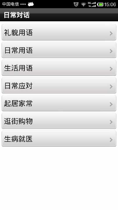 2、包含日常对话、生活杂事、常识应用、交际应酬等大类,每个大类下有各个场景的小类,清晰的分类更加便于掌握和使用不同场景下的词汇和语句。