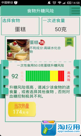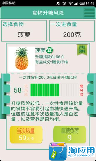 很方便地输入食物和份量,立刻为您计算出升糖指数、热量以及升糖负荷,告诉您该餐次的餐后2小时血糖升糖风险指数从此您能明明白白地吃,应该不应该吃,应该吃多少,怎么吃效果最好,点点糖尿病升糖指数计算器就知道啦