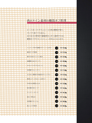 健康、ダイエットに関心のある方のためのレシピアプリです。摂取すれば脂質に替わる糖質を多く含んだ食材を使わず、各メニューが糖質10g以下で付け合せも含め、しっかり満腹になれるメイン料理を、肉・魚介・野菜と食材別に紹介しています。また、食材別の糖質量リスト、食材を選択すれば関連メニューが一括でわかるオリジナルインデックスといったアプリならでは機能も充実のレシピ本になっています。
