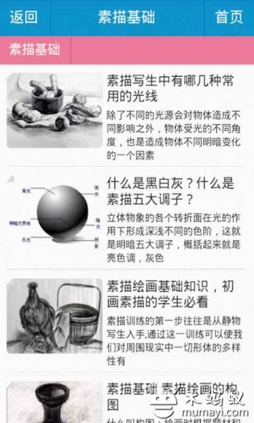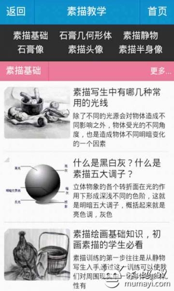 本应用包含素描基础技巧,素描静物技巧,素描人物头像技巧,半身素描技巧,石膏素描技巧等等
