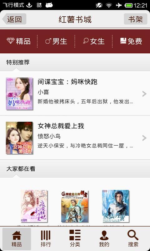 红薯阅读 是红薯小说阅读网开发的一款Android平台海量精品图书和强大阅读功能的手机软件,集当前最火的网络小说书库、本地小说阅读功能于一体,秉承红薯小说网”看书,交友,轻松生活”的宗旨,旨在为读者创造完美的小说阅读体验。