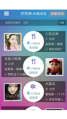 用户通过兴趣场景选择约到附近好友一起聚餐、k歌、喝咖啡等。我们精选了上万家具有社交气氛的咖啡厅、餐厅、酒吧、影院等适合单身男女约会的场景,让陌生男女快速地发现共同的兴趣话题并展开约会。用户可以通过约你广场选择响应同城附近单身男女发起的邀请或邀请附近的人参加您的活动。