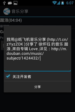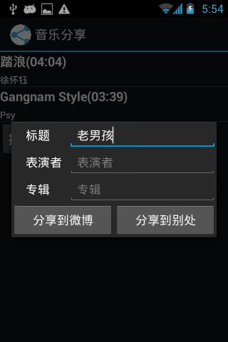 想分享音乐心情 自己打字发条微博太麻烦了 音乐分享 一键搜索专辑介绍地址、专辑图片 再点一下 微博就发上来了 想分享到别处 轻点 即调用其它SNS应用 朋友要听 依旧轻点 蓝牙发送音频