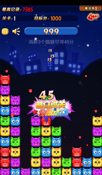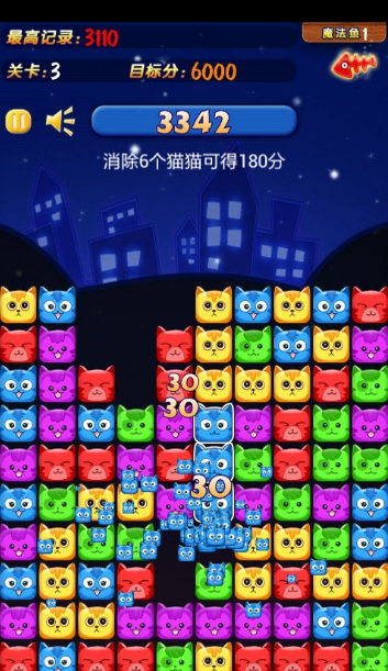 点击两个或两个以上的同色猫猫即可消除,单指操作哦.