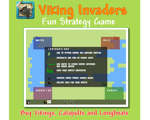 维京入侵者是一个战争游戏,1至4名玩家。移动你的维京氏族从他们的城堡,剑,火弹射器,板船战斗和航行下来的峡湾,攻击敌人的城堡,从宝箱抓住黄金。
