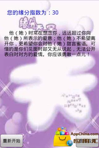 亲爱的朋友,你正在热恋吗?你正在感情的漩涡中挣扎,不知道是进是退吗?你是否徘徊在感情的痛苦中无法自拔呢?还是正在欢天喜地的享受爱情呢?不妨都来测试一下,看你们之间到底有没有缘分吧。不管是真是假,或许对你大有帮助呢,呵呵,一起来吧……