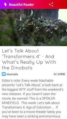 Beautiful Reader是一款设计精美的Feedly阅读器应用,登陆Feedly账号后可以通过翻页的方式在该应用中阅读你订阅的Feedly RSS源,不过想要阅读详细的资源的话,你需要打开浏览器才行。