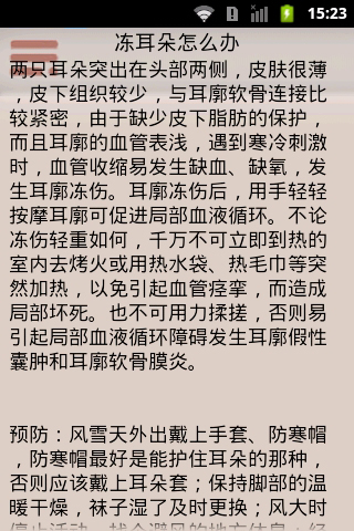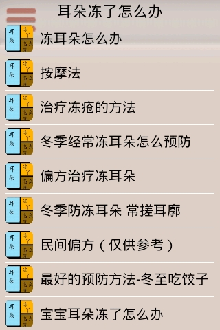 耳朵冻了怎么办?本应用内容包括冬天冻耳朵、女性冻耳朵、儿童冻耳朵、老人冻耳朵,原因、症状、预防、治疗、偏方、用药、问医生、快速治疗等我们整理了最全面的冻耳朵知识,最多的民间偏方,做最好的冻耳朵用药宝典助手,最实用的冻耳朵防治手册,2013这个冬天不再冻耳朵