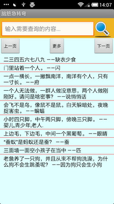 这是一款基于ANDROID系统的脑筋急转弯离线查询系统,包含了3600条常见的脑筋急转弯,是您无聊时开心的小玩意,也是逗女朋友开心的好帮手