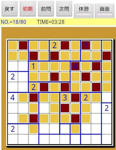 ルールに従って盤面を黒マスで塗りつぶすパズルです。