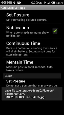 自动快拍相机是一款偷拍神器,主要是依靠手机的重力传感器来控制相机拍照,在设定好感应器之后应用会后台帮你完成相应的拍摄工作,遇上美眉你就可以“光明正大”的偷拍,再也不用担心会被别人发现了。