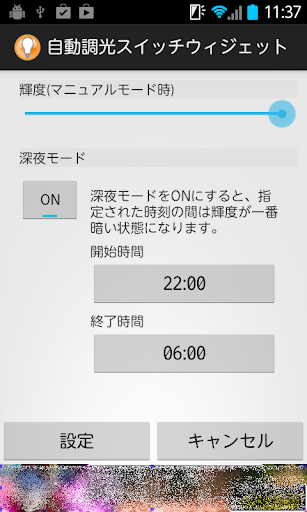 また、このウィジェットには「深夜モード」という設定があり、指定した時間の間は自動的に一番暗い状態にすることができます。
