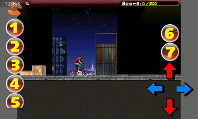 游戏中你是一名自行车越野赛中的精英赛手,要以尽量快的速度平稳地行驶在赛道上。当然,赛道不是一马平川的,会有各种各样的崎岖地形。屏幕右下角,向上和向下的箭头分别代表自行车向前和向后行驶;向左和向右的箭头分别控制自行车的后轮和前轮,使之保持平衡。相信大家都是精英,一起来体验吧。