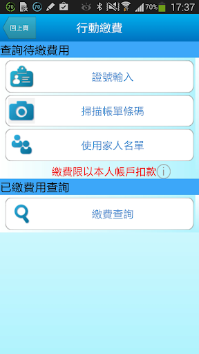 7. 行動繳費:提供以身份證字號或掃描帳單上條描等方式取得待繳之醫療費用,只需要輸入本人之活期帳戶就可繳交門診費用,節省了等待排隊繳費的時間。