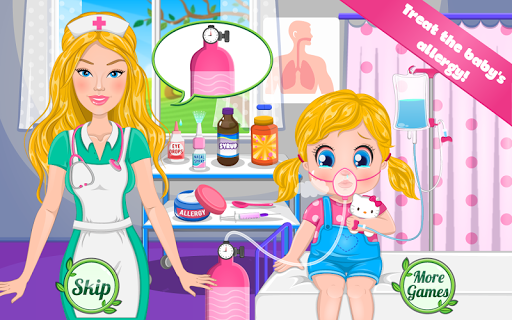 你需要给她一个氧气罩使得她的呼吸顺畅。给她鼻腔喷雾剂和眼药水,这样眼睛就不再流泪了。并且,给她涂治疗全身过敏的过敏霜,那么过敏的治疗过程就完成了。然后,和艾利的小宝贝玩装扮游戏吧,给她找一个可爱的的衣服去公园里面玩耍。享受我们的新游戏,叫做芭比的宝贝过敏了!