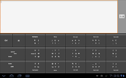 主要應用於1280X800解析度以上的平板電腦,讓使用者可以如同鍵盤輸入一般,為了應用於平板輸入,故採用組合鍵輸入,讓螢幕上最多只有18個按鍵方便使用雙手打字(未來將推出注音與羅馬拼音等中文輸入方式)