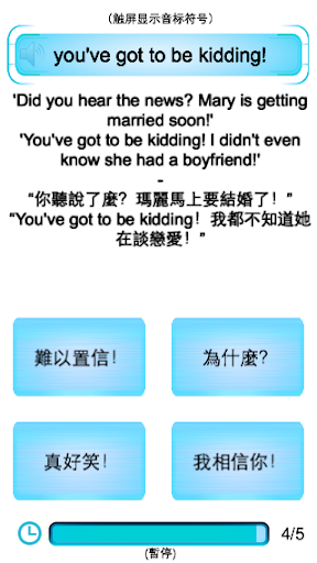 想學地道英語口語嗎?這款由英語母語人士開發的遊戲寓教於樂,能讓你在趣味問答中學習多達200個教科書上少有的口語表達,還有包囊中文翻譯,此外,此應用點讀功能。還等神馬? ?快來和小伙伴們一同體驗通關晉級的快感吧! ! !